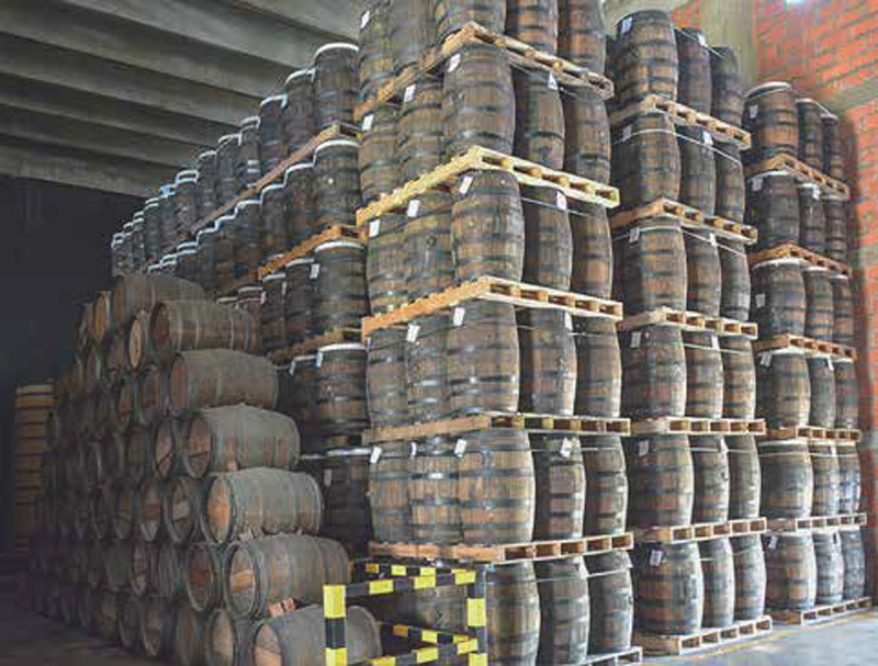 Foto destilería actual de ron donde se ven los sistemas tresbolillo y palets.